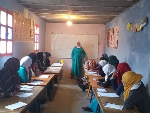 After we ate breakfast, we moved to a classroom that is used as an office of a local association. Members of the local population arranged the tables before we arrived, and cleaned the room. The first thing that grabbed my attention was two ropes on a wall. Small stories in Arabic and French were hung as if they were waiting their turn to dry, but unfortunately, the sun of the light does not dare to cross the cold walls. Additionally, on the whiteboard, there was no trace of a lesson but the date of the last session, going back to three weeks ago. We have been told that schools were closed since the beginning of the national strike by teachers forced into contractual teaching started at the beginning of this month. We put the notebooks and pens on the tables and waited for the women to come. The fast wind hitting the open door and the window wasn’t an obstacle for them, neither was it for us as we watched the roads to see if more women were coming.