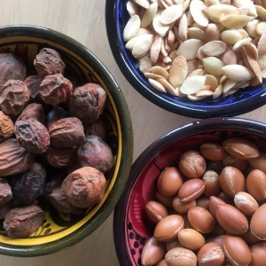 Yellow bowl: Dried Argan fruits; Pink bowl: Argan nut; Blue bowl: Kernels